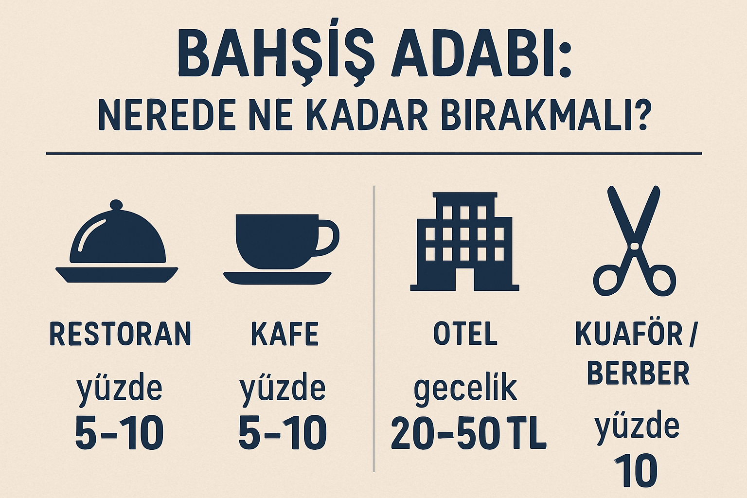 Bahşişin tarihi oldukça eskiye dayanır. Türkiye’de de özellikle restoran ve kafelerde bahşiş bırakmak yaygın bir alışkanlıktır. Genel olarak, hesabın yaklaşık %10’u kadar bahşiş bırakmak uygun kabul edilir. Eğer hizmetten çok memnun kaldıysanız bu oran %15’e çıkabilir. Bar ve meyhanelerde hesabın küçük bir yüzdesi ya da bozukluk bırakmak da yeterli olur.